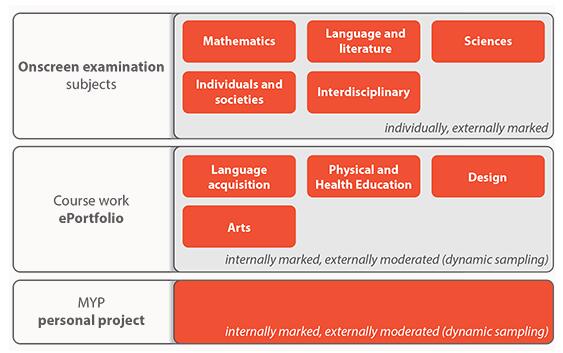 與傳統考試不同,MYP的外部評估是通過電腦進行考試,稱為on-screen examinations,考查五大學科內容:數學、語言與文學、科學、個人與社會、跨學科內容,其中跨學科考試考的是同一個學科組中不同科目的內容。考試時間為兩小時。