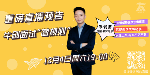12月4日19:00A加未來聯合創始人季偉偉老師,將在《牛津劍橋面試揭秘》的直播中為您一一解答。掃描下方二維碼加A加未來留學規劃老師微信,可預約直播。