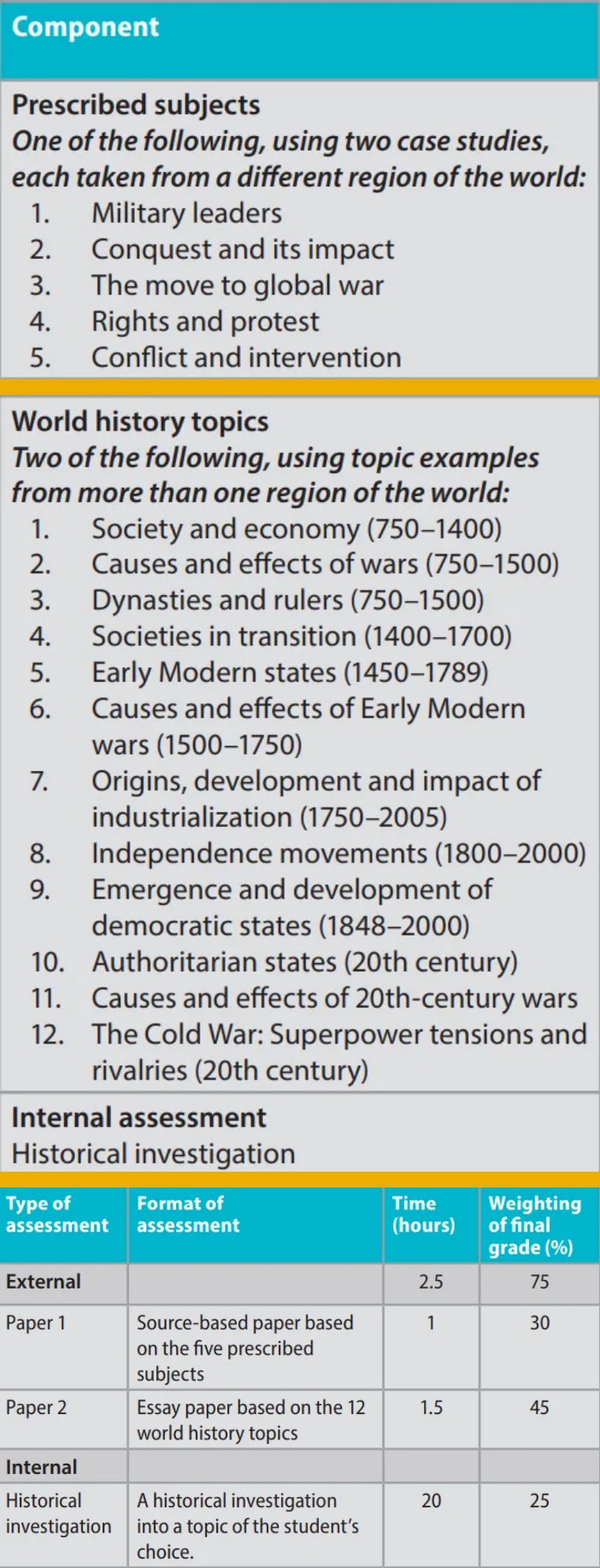 IBDP歷史主要分為Prescribed Subjects(規定主題)和World History Topics(世界史主題)。其中規定主題為五選一,世界史主題十二選二,共學習三個主題。如果這門科目選擇HL,則需要再多加三個主題,其中也必須在Depth Studies(深度研究)中選擇一個主題。