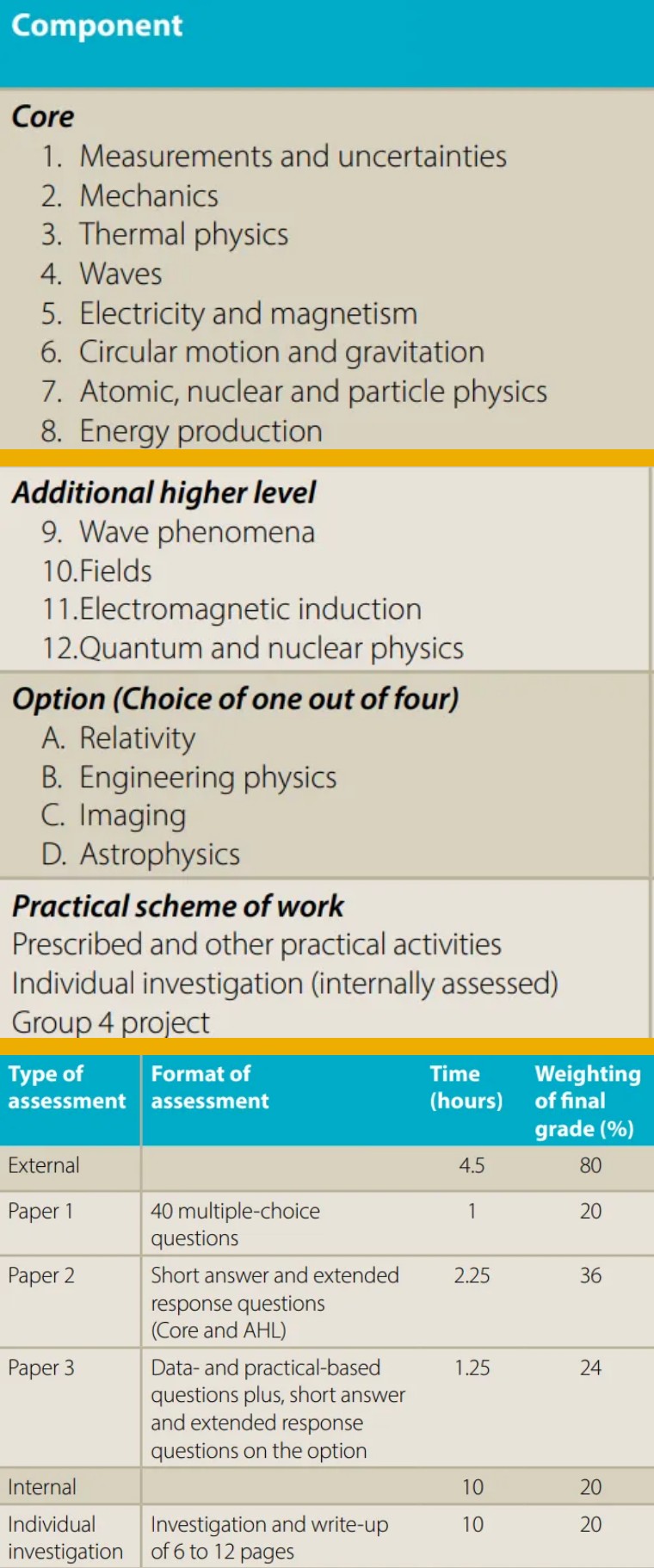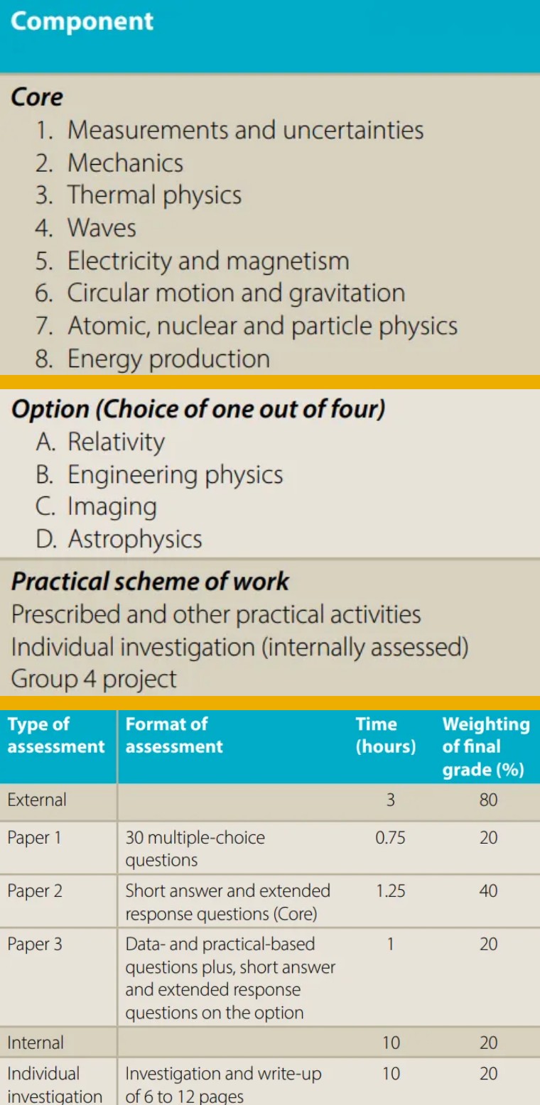 SL物理總學(xué)時(shí)150小時(shí),要求有30小時(shí)的物理實(shí)驗(yàn)和10小時(shí)的跨學(xué)科項(xiàng)目。HL物理總學(xué)時(shí)240小時(shí),要求有50小時(shí)的物理實(shí)驗(yàn)和10小時(shí)的跨學(xué)科項(xiàng)目。實(shí)驗(yàn)時(shí)間不包括學(xué)生書寫實(shí)驗(yàn)報(bào)告的時(shí)間。